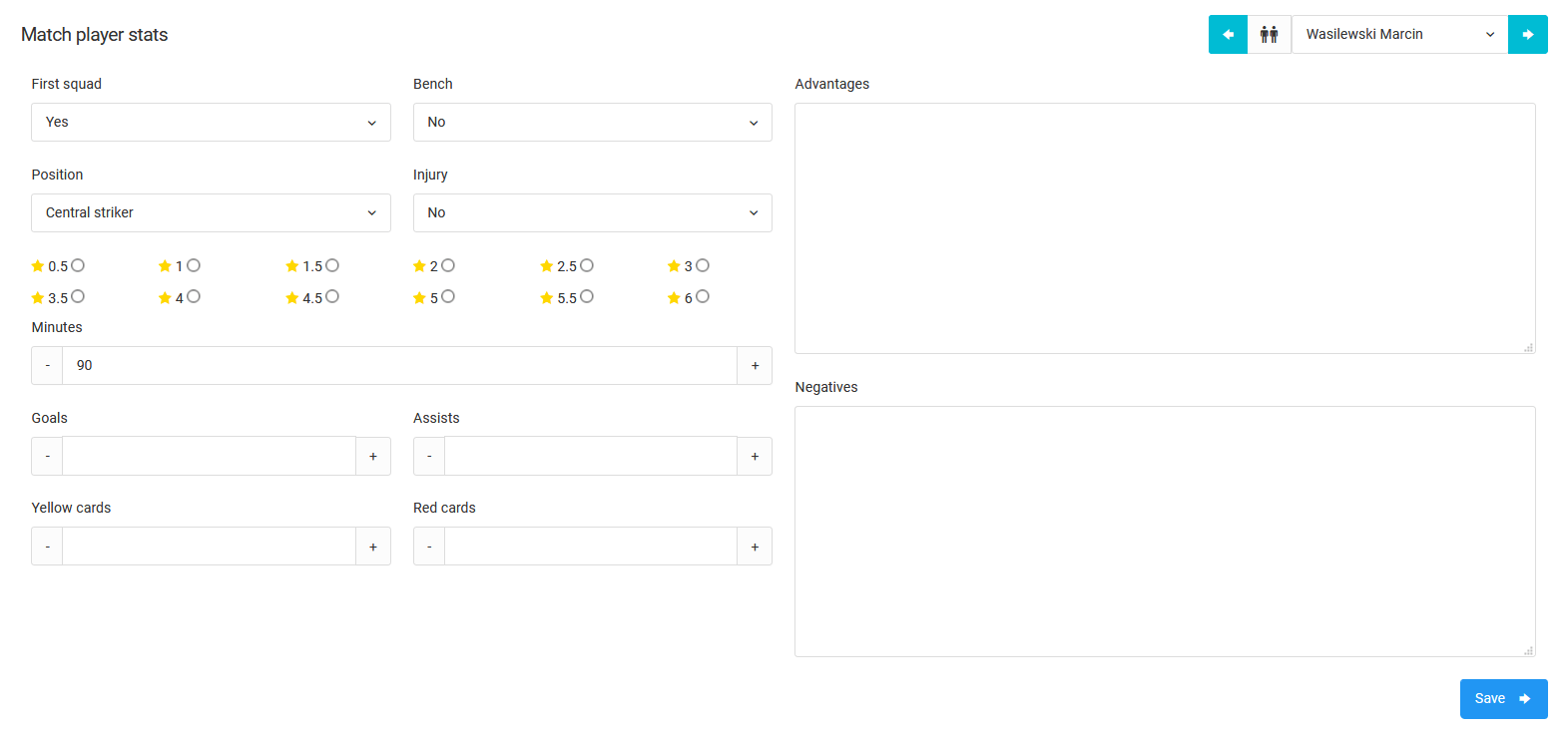 Όπως μπορείτε να δείτε στην παραπάνω εικόνα, μπορείτε να εισάγετε χειροκίνητα στατιστικά στοιχεία μεμονωμένων παικτών. Εκτός από τα βασικά στοιχεία όπως τα γκολ που έχουν σημειωθεί ή οι πόντοι που έχετε σημειώσει, μπορείτε να προσθέσετε πληροφορίες σχετικά με τα λεπτά στο γήπεδο, βοηθούς και πέναλτι. Επιπλέον, μπορείτε να αξιολογήσετε έναν παίκτη για την απόδοσή του στον αγώνα και να περιγράψετε τα πλεονεκτήματα και τα μειονεκτήματα του παιχνιδιού του στον αγώνα. Το τελικό αποτέλεσμα των ολοκληρωμένων στατιστικών αγώνα είναι μια αναφορά πλήρους αγώνα.