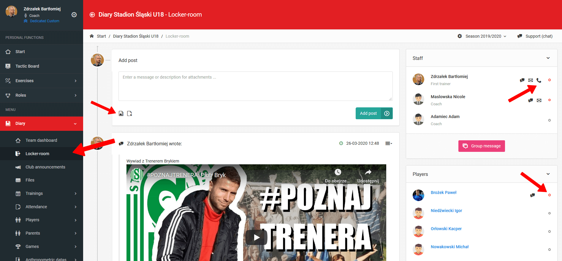 The locker-room and board function as a closed user group where you can share files, videos, photos or links. Moreover, here you can initiate a group conversation with selected users as well as a private conversation with one designated coach. The locker-room and board are also available via the mobile application, and every post you add generates a push notification for designated users.